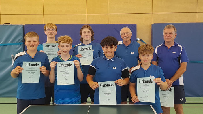 Hier die Platzierungen im Einzelnen: Jungen11 Einzel: 1. Max Benkert, 2. Jonas Hartmann, 3. Dominik Kruppa und Mika Ezli Jungen11 Doppel: 1. M. Benkert / D. Kruppa, 2. J. Hartmann / Mathis Utsch Jungen13 Einzel: 1. M. Benkert, 2. Jonas Zakotnik, 3. Johan Jaspert u. M. Ezli Jungen13 Doppel: 1. J. Zakotnik / J. Jaspert, 2. M. Benkert / Mario Minnert Jungen15 Einzel: 1. Chris Wolf, 2. J. Zakotnik, 3. M. Minnert und Erik Schlotter Jungen15 Doppel: 1. Chr. Wolf / J. Zakotnik, 2. M. Minnert / Jonathan Gotzol