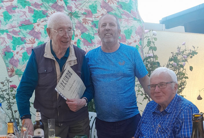 Zur Besprechung der letzten Vorbereitungen für die Saison 2025/2026 traf sich am 11. August der Vorstand des TTC beim Vorsitzenden Manfred Minnert. Der Austausch war konstruktiv und ganz nebenbei lieferte der glühende Grill nach und nach Steaks und Würstchen, die auch den Gästen mundeten. Neben Reimund Kilb (Kassenprüfer) und Gernot Bender war auch Gerhard Kühn erschienen. Gerhard ist unser einziges Mitglied "Ü90" und es war uns eine Ehre, ihm an diesem Abend seine Ehrung für 25 Jahre Mitgliedschaft zu überreichen. Seine Freude war ebenso groß. Mit dem einen oder anderen kühlen Bier ließen wir den Abend ausklingen.